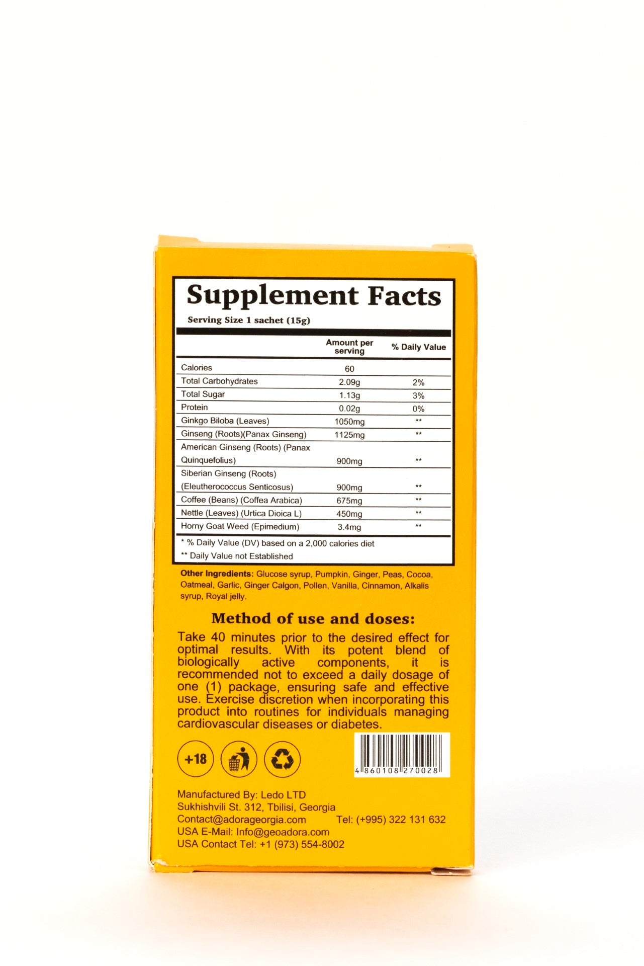 Say goodbye to fatigue and embrace a passionate and vibrant state of energy and passion. Adora sachets are infused with natural, powerful ingredients to support overall vitality and sexual wellness. Adora works great for woman to boost energy and promote being in the mood!